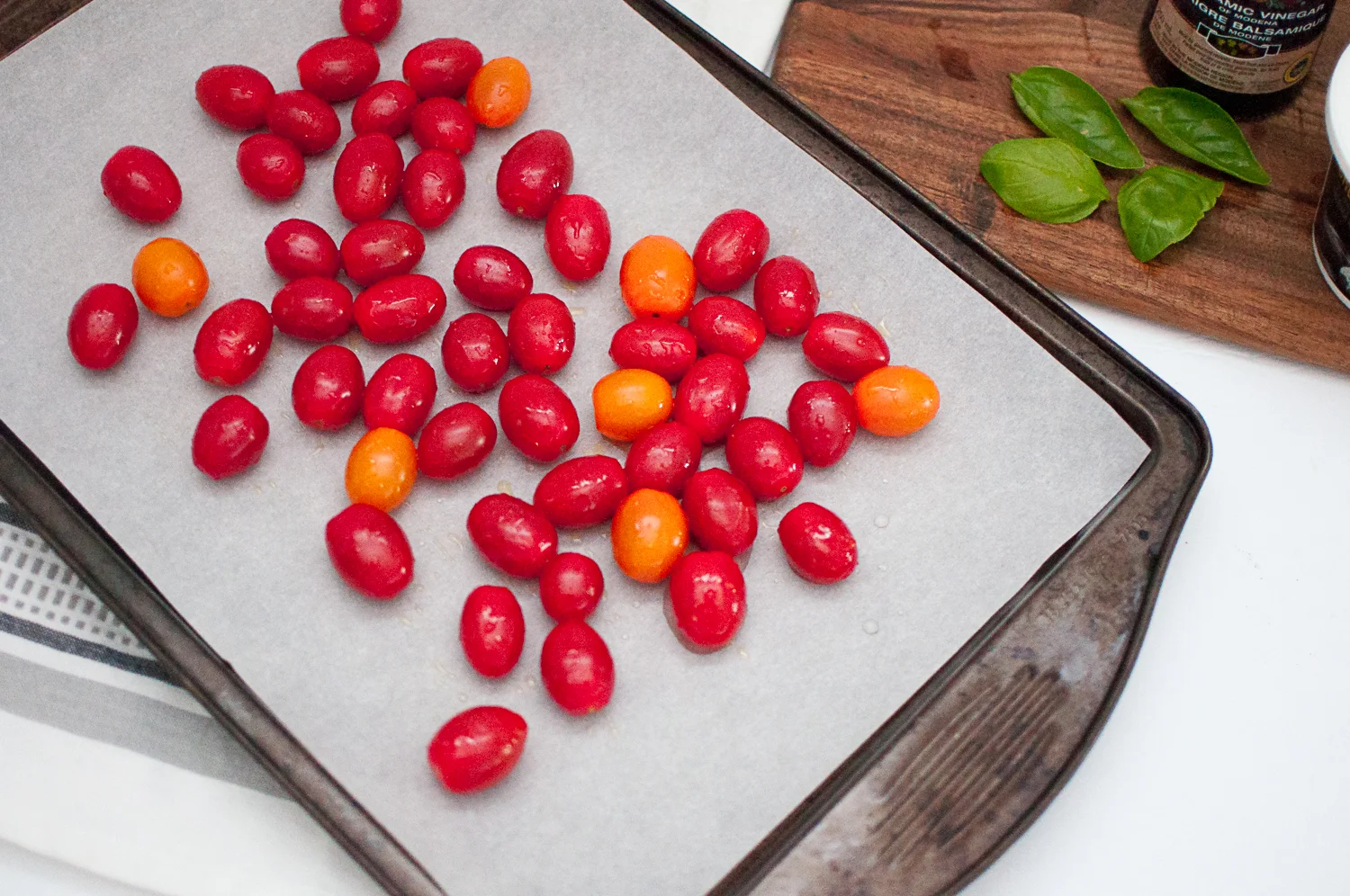 2. Toss tomatoes with olive oil and sea salt and place on parchment lined baking sheet. Bake at 400 for 15-20 minutes