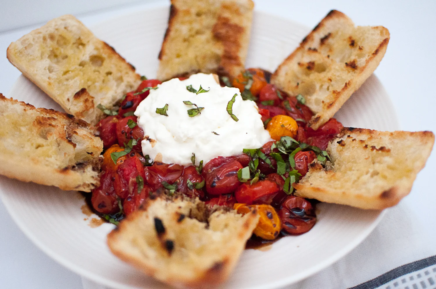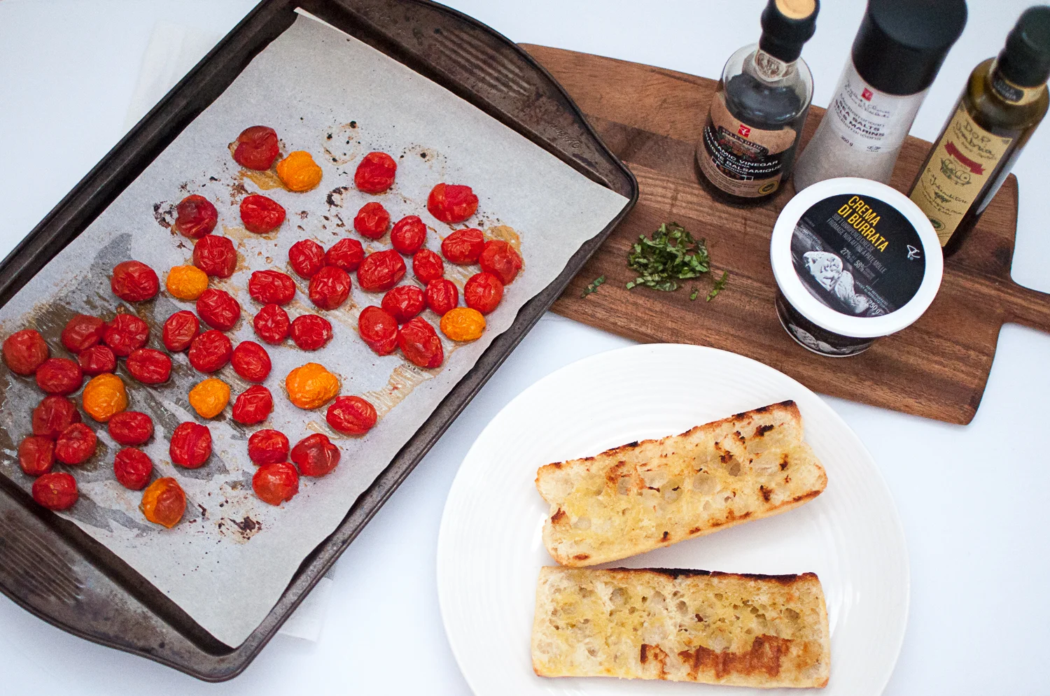 If you're anything like me you won't be able to get enough of these soft, warm roasted tomatoes drizzled with olive oil, balsamic, sea salt, fresh chopped basil and a generous helping of burrata. Add in some grilled bread and you really can't go wrong.